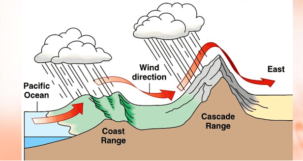 This diagram illustrates how the mountain ranges affect moisture coming from the Pacific Ocean. As it encounters hills and mountains, it is forced to rise. As it rises, it cools dropping most of its moisture west of the Cascades and Olympics. Very little is rain is left as it crosses the Cascades into the dessert east of the mountains.